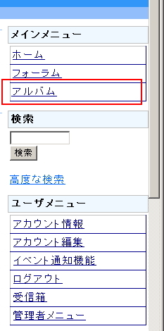ログイン後、画面右側にある「メインメニュー」より「アルバム」をクリックします。